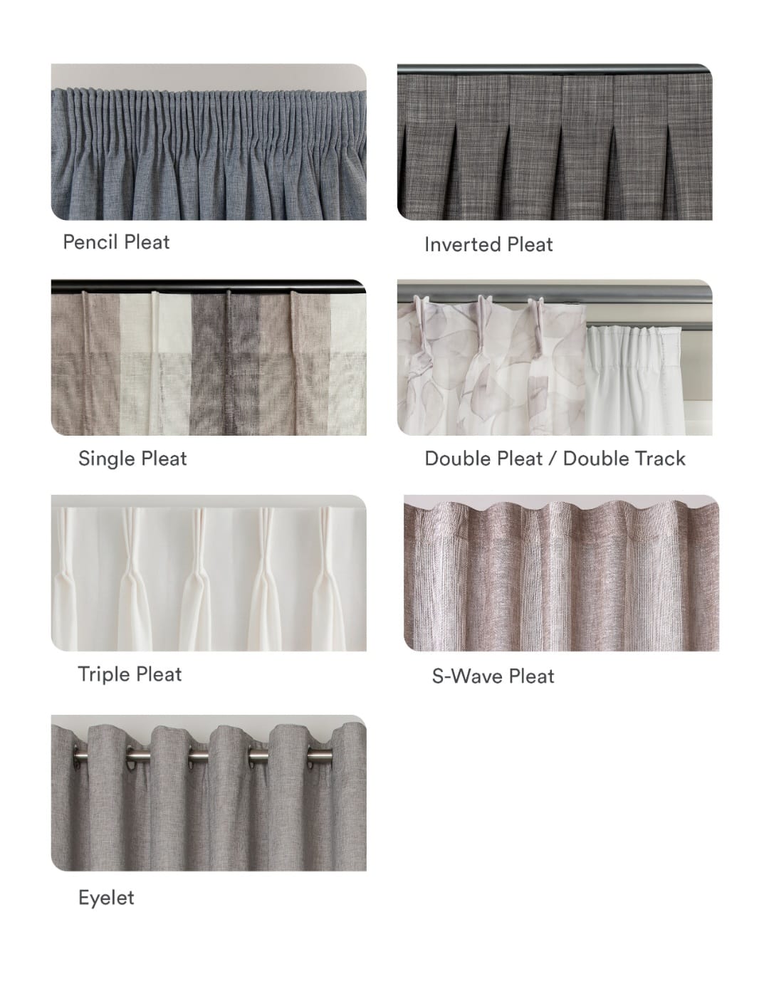 Pencil pleat ⦁ Inverted pleat ⦁ Single pleat ⦁ Double pleat ⦁ Triple pleat ⦁ Pinch pleat ⦁ Box pleat ⦁ S-wave style ⦁ Eyelet style